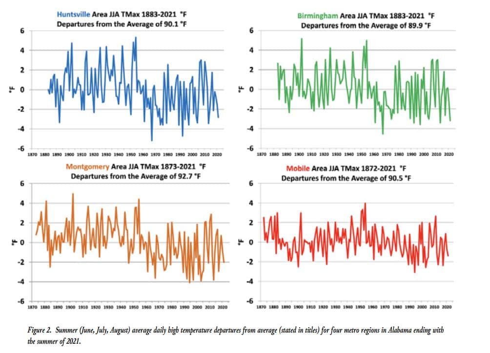 (01/06/23) In case you’ve been worried about the threats of rising temperatures and extreme weather events, Dr. David South, retired Auburn University forestry professor recently sent us some graphs of 100+ years of Alabama summer temperatures (Source: A Practical Guide to Climate Change in Alabama by John Christy). Also, yesterday, PowerLine Blog posted a story, Extreme Weather Events Declining, that may reduce your fears that hurricanes or tornadoes will blow away all your trees (they might, but that would not be abnormal).