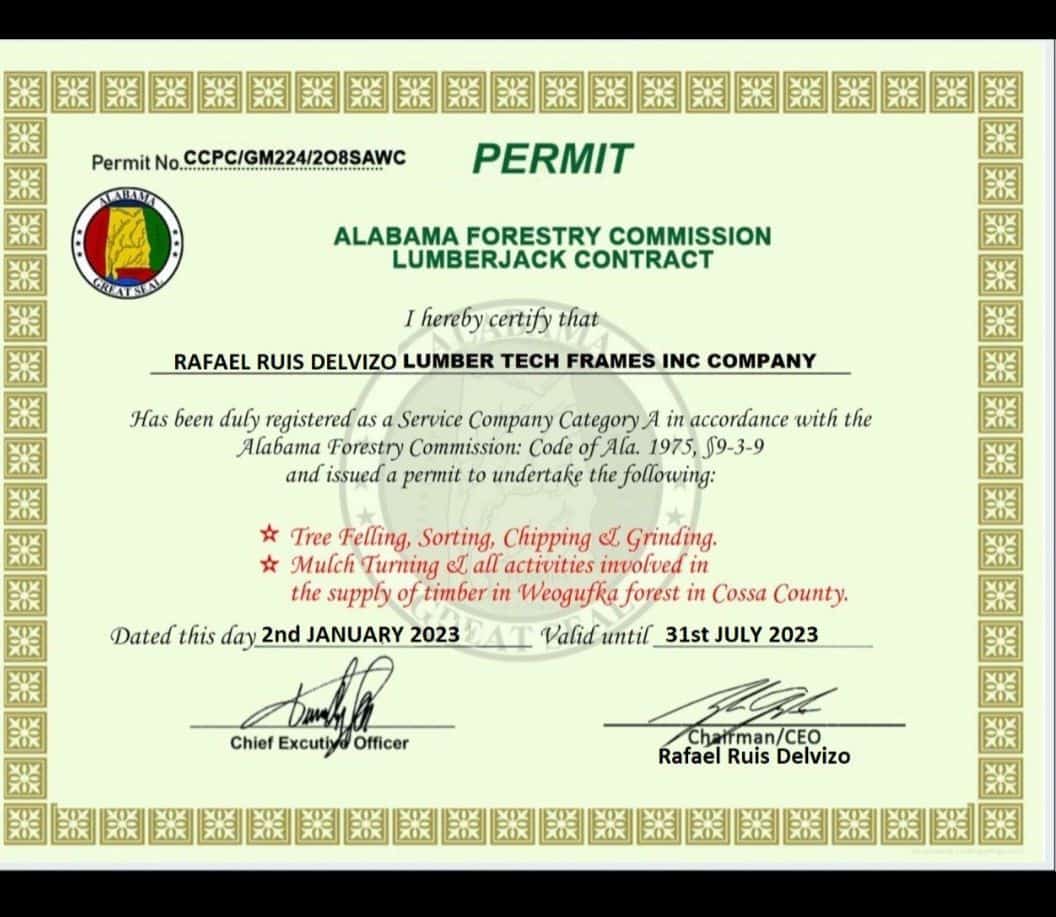 (08/08/23) Beware of Logging Scam! The Alabama Forestry Commission is warning forest landowners to beware of a timber cutting scam. The permit / “lumberjack” contract shown in this photo is a fake. Neither Rafael Ruis Delvizo nor the Lumber Tech Frames Inc. are representatives of the Alabama Forestry Commission and are in no way affiliated with the agency. If you are contacted or have been approached by anyone using this counterfeit document, please contact Scott Rouse, Deputy Attorney General for the Alabama Forestry Commission, at (334) 328-7831.